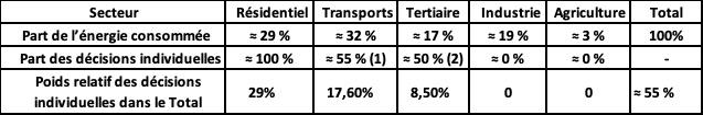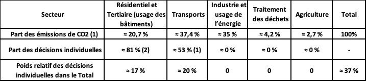 Ce tableau montre que 37 % des émissions de CO2 du pays dépendent, au moins en partie, de décisions individuelles. C’est moins que pour l’énergie, mais c’est plus efficace pour le climat puisque l’impact est alors direct. Dans les deux usages (bâtiments et transports) les réductions des émissions dépendent en effet avant tout des énergies utilisées, donc des technologies capables de les mettre en œuvre (par exemple pompes à chaleur pour les bâtiments, voitures électriques pour les transports). Dans ce contexte, les progrès technologiques jouent le rôle principal. Mais cela demande à nouveau du capital et du temps, il faut par exemple une douzaine d’années voire davantage pour remplacer un parc automobile.