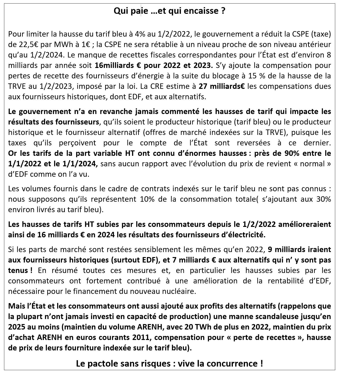 Au total, le tarif bleu TTC aura ainsi augmenté de 31% de février 2022 au31/1/2024 et de 45% environ au 1/2/2024, sans aucune visibilité pour l’avenir.