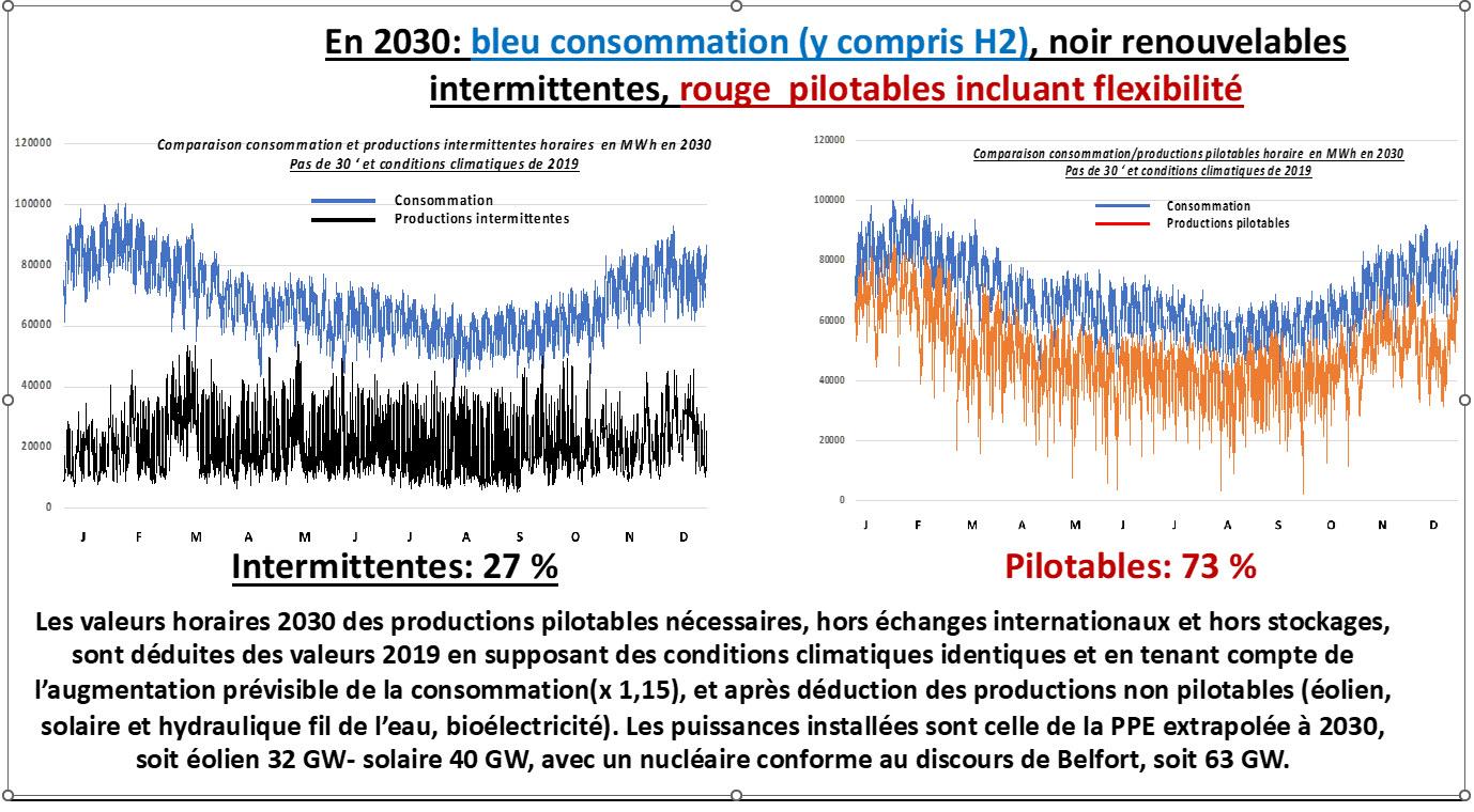 • En 2030 avec une évolution des EnR intermittentes conforme à la PPE (Programmation Pluriannuelle de l’Energie), extrapolée de 2028 à 2030, et sans arrêt de nouveaux réacteurs conformément au discours de Belfort du Président de la République.