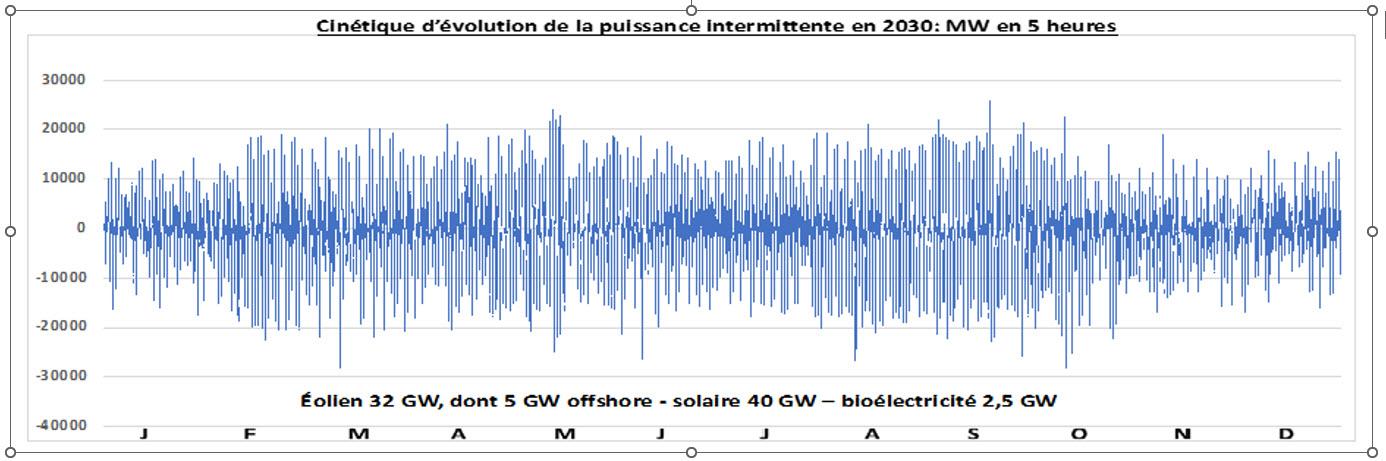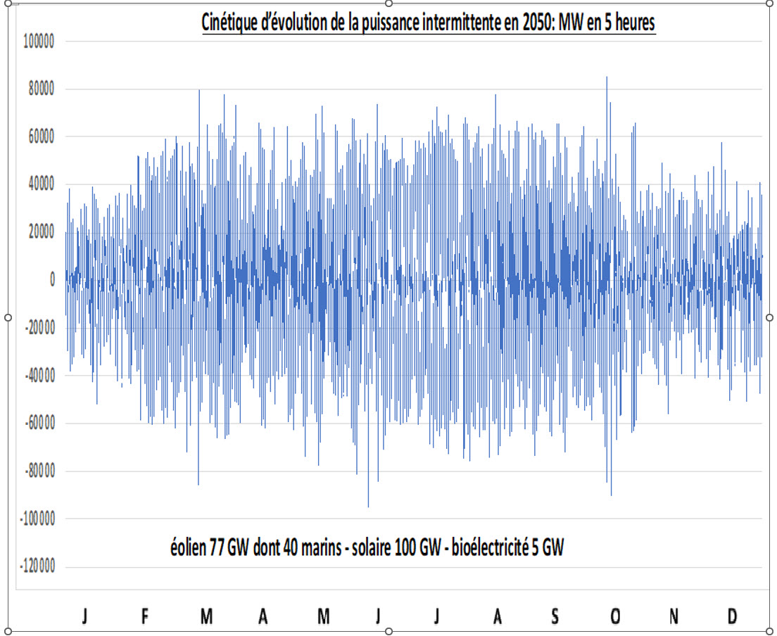 De plus, les vitesses d’évolution de la puissance générées par les moyens de production intermittents vont devenir difficilement compatibles, voire incompatibles, avec celles des moyens pilotables. Sauf écrêtage des puissances délivrées les variations de puissance en 5 heures vont devenir considérables :  souvent une quinzaine de GW à la montée comme à la baisse en 2030, encore à la limite du gérable en hiver grâce à la manœuvrabilité du parc nucléaire, mais pas en été, avec une puissance appelée faible et un parc centrales pilotables en phase de maintenance ou de rechargement. En 2050 les fluctuations de puissance seront fréquemment, dans les mêmes conditions, d’une quarantaine de GW en 5 heures, et au maximum de 80 GW, ce qui ne sera plus gérable sauf écrêtement radical des ENR intermittentes et effacements massifs.