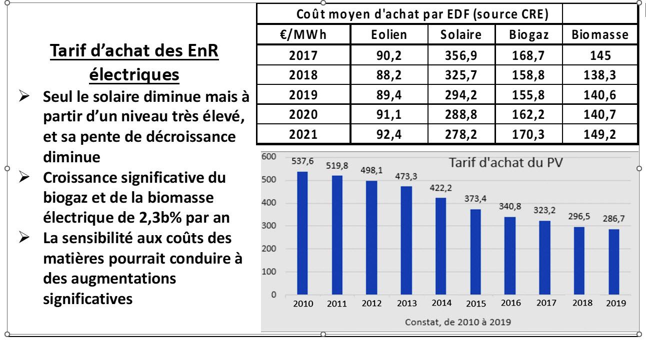Si on observe maintenant l’évolution du prix d’achat moyen annuel des principales ENR électrogènes, il ne cesse de croitre, sauf pour le solaire (mais à un niveau très élevé et avec une baisse qui ralentit).