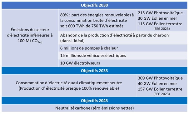 Pour atteindre l’objectif de la Loi Fédérale sur la Protection du Climat pour le secteur de l’énergie en 2030 /6/, les émissions du secteur électrique devraient être inférieures à 100 Mt CO2éq. Le pays table sur un presque triplement (360 GW, cf. tableau 1) de la capacité éolienne et photovoltaïque (134 GW en 2022). Toutefois, en l´absence de dispositifs de stockage d´énergie suffisants, des moyens pilotables en support resteront indispensables pour suppléer l´intermittence des productions intermittentes. C’est pourquoi le gouvernement mise sur des centrales au gaz fossile durant la phase de transition, en substitution aux centrales nucléaires et à charbon, dans l’attente d’un remplacement progressif du gaz fossile par un hydrogène vert au-delà de 2030.
