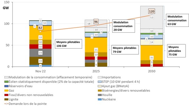 La Figure 2 illustre le scénario pour 2030, sur la base des données du rapport de gestion du réseau, avec une capacité de moyens pilotables d’environ 75 GW et une capacité de modulation de la consommation de 63 GW pour passer la pointe annuelle.