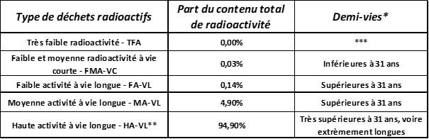 Tableau 1 : classification des déchets en fonction de leurs demi-vies