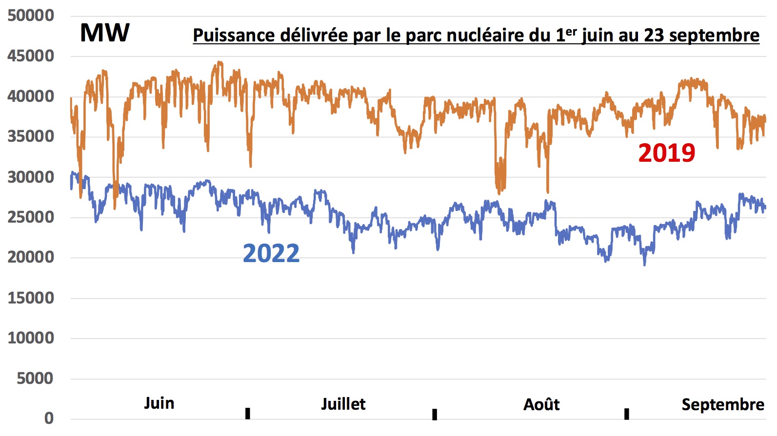 Belle unité dans les informations données aux français : plus de la moitié du parc nucléaire est arrêtée et il manquerait donc environ 32 000 GW sur 61 000 (ou 31 GW sur 61). Cette vraie/fausse donnée repose sur une comparaison des chiffres sans analyse et interprétation, que contredit immédiatement la réalité de cet été, comparé à celui de 2019 (données RTE Eco2Mix) : le déficit n’est clairement pas si important :