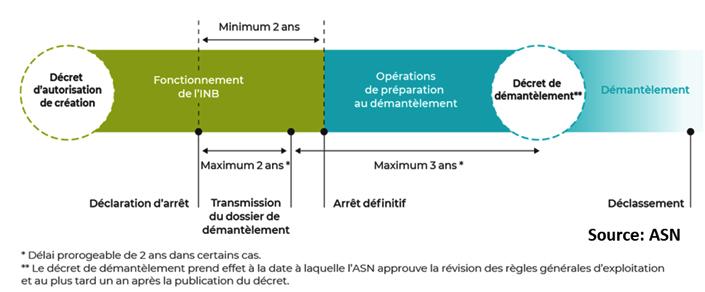 Phase 1 : dans un délai de deux ans au maximum après la déclaration d’arrêt définitif de l’exploitation par l’opérateur, le réacteur étant toujours en fonctionnement , son opérateur transmet à l’ASN le « Dossier de démantèlement », qui couvre la totalité des opérations : modalités de démantèlement et de réhabilitation du site, état de l’INB lors de l’arrêt définitif, mémorisation des opérations, état du site en fin de démantèlement. Il est accompagné des très lourdes mises à jour des principaux dossiers réglementaires (rapport de sûreté, règles générales d’exploitation, plan d’urgence interne, …), adaptés à un effectif réduit et aux nouveaux corps de métiers nécessaires. L’ASN recommande que ce dossier soit déposé au moins trois ans avant la date envisagée pour le début des opérations de démantèlement, d’autres procédures pouvant encore alourdir ce délai (Enquêtes publiques et consultations locales, Euratom, …).