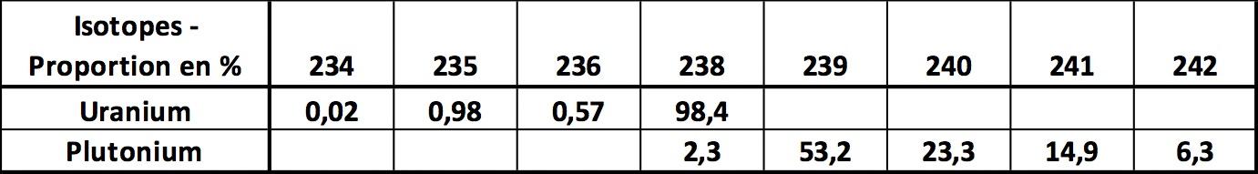 - Le plutonium (Pu), un peu plus de 1 %, qui est un élément artificiel créé pendant l’irradiation du combustible par captures de neutrons par l’U238 Ce plutonium comprend 5 isotopes, seuls deux d’entre eux, majoritaires, étant fissiles au même titre que l’U235, le Pu239 et le Pu241[2].