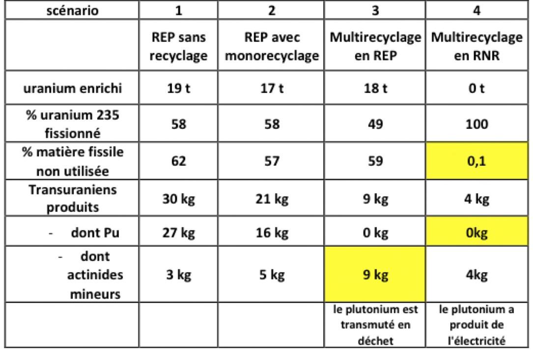 Le tableau ci-dessous montre clairement les performances inégalables des surgénérateurs (colonne 4), qu’il s’agisse de la consommation ou de la production de déchets ultimes.
