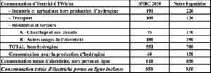La demande finale d’électricité est de 850 TWh par an, production d’hydrogène incluse, soit 910 TWh pertes en ligne incluses.