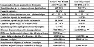 La comparaison des dépenses totales annuelles des deux scénarios tient compte du surcoût des réseaux nécessités par les production éolienne et solaire (dispersion des sources et back-up), de la différence de production d’hydrogène et de la différence de dépenses en économie d’énergie.