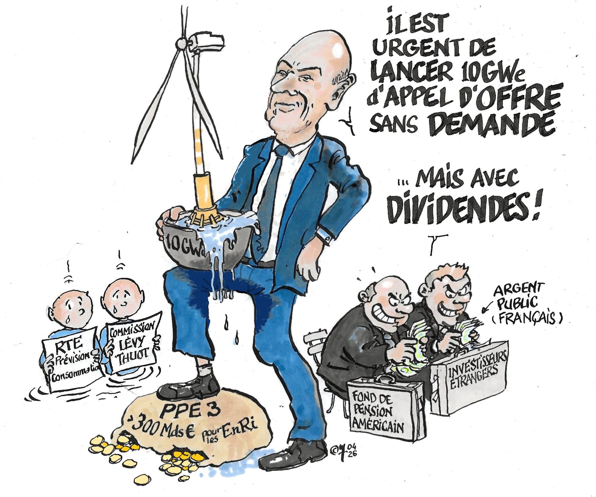 En 2025 la France a consommé 451 TWh d’électricité, comme en 2024, en a produit 547, dont 521 sont déjà bas carbone, et exporté 92 TWh. Et que nous propose Monsieur Lescure dans un langage martial ? Nous devrions engager des investissements somptuaires en éoliennes marines et panneaux photovoltaïques, largement importés, auxquels devront être adossés d’autres investissements tout aussi massifs en réseaux et moyens nécessaires à la compensation de la variabilité de ces nouveaux venus. Il nous annonce de surcroît, dès cette année, deux gigantesques appels d’offre d’une dizaine de GW d’éolien en mer, les plus coûteux bien sûr, tout en oubliant de rappeler qu’une quinzaine de GW de moyens de production intermittents sont déjà commandés ou prêts à débiter sur le réseau. On parle de milliards d’€ annuels, tout ceci bien sûr en assurant aux porteurs de ces projets, souvent étrangers et très subventionnés par une France généreuse, des dividendes garantis sur 20 ans et à la hauteur des objectifs annoncés. Une époque vraiment formidable !