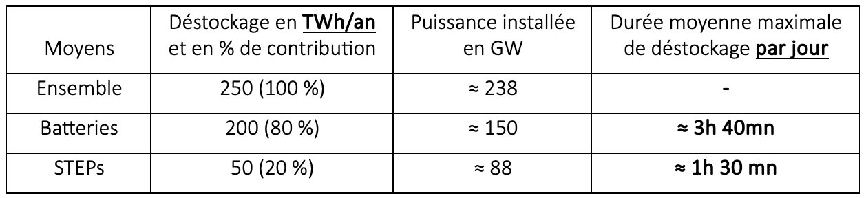 NB : il s’agit là de capacités de stockage-déstockage en électricité, les batteries et les STEPs étant supposées avoir la même puissance installée en charge et en décharge.