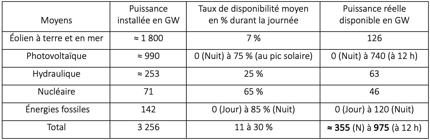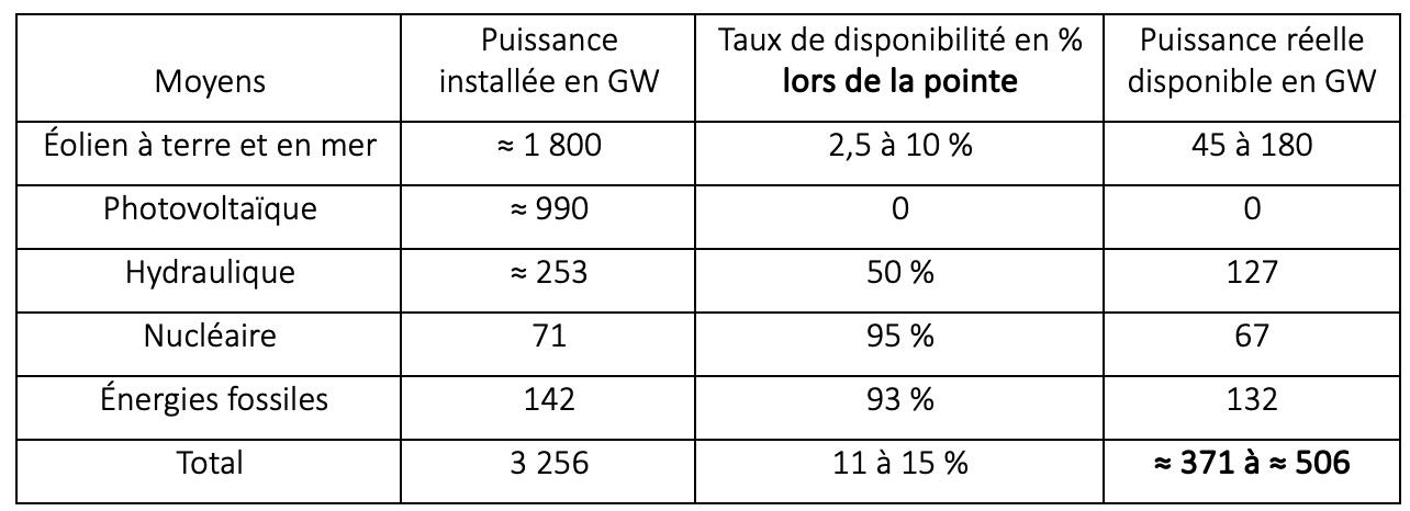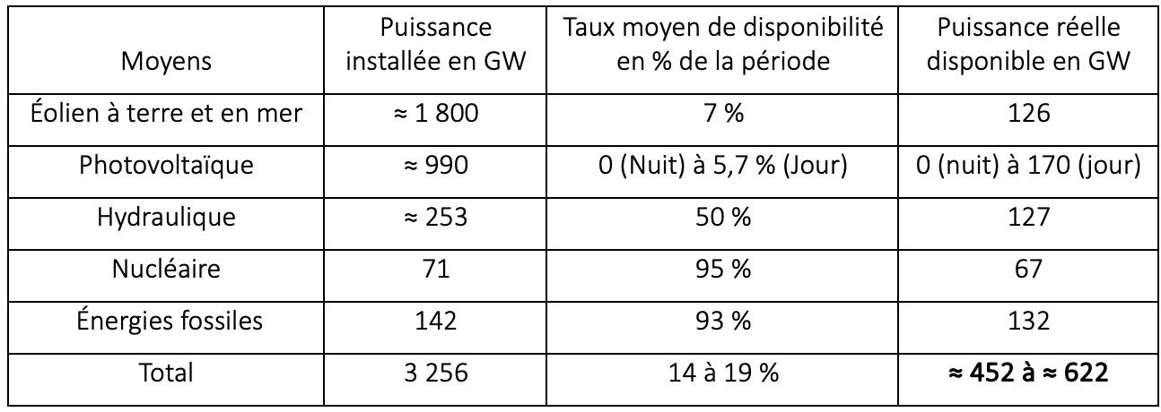 La production éolienne fluctuant dans ces circonstances entre 2,5 et 10 % de la puissance installée, on retiendra une puissance moyenne disponible de l’ordre de 7 % sur la période.