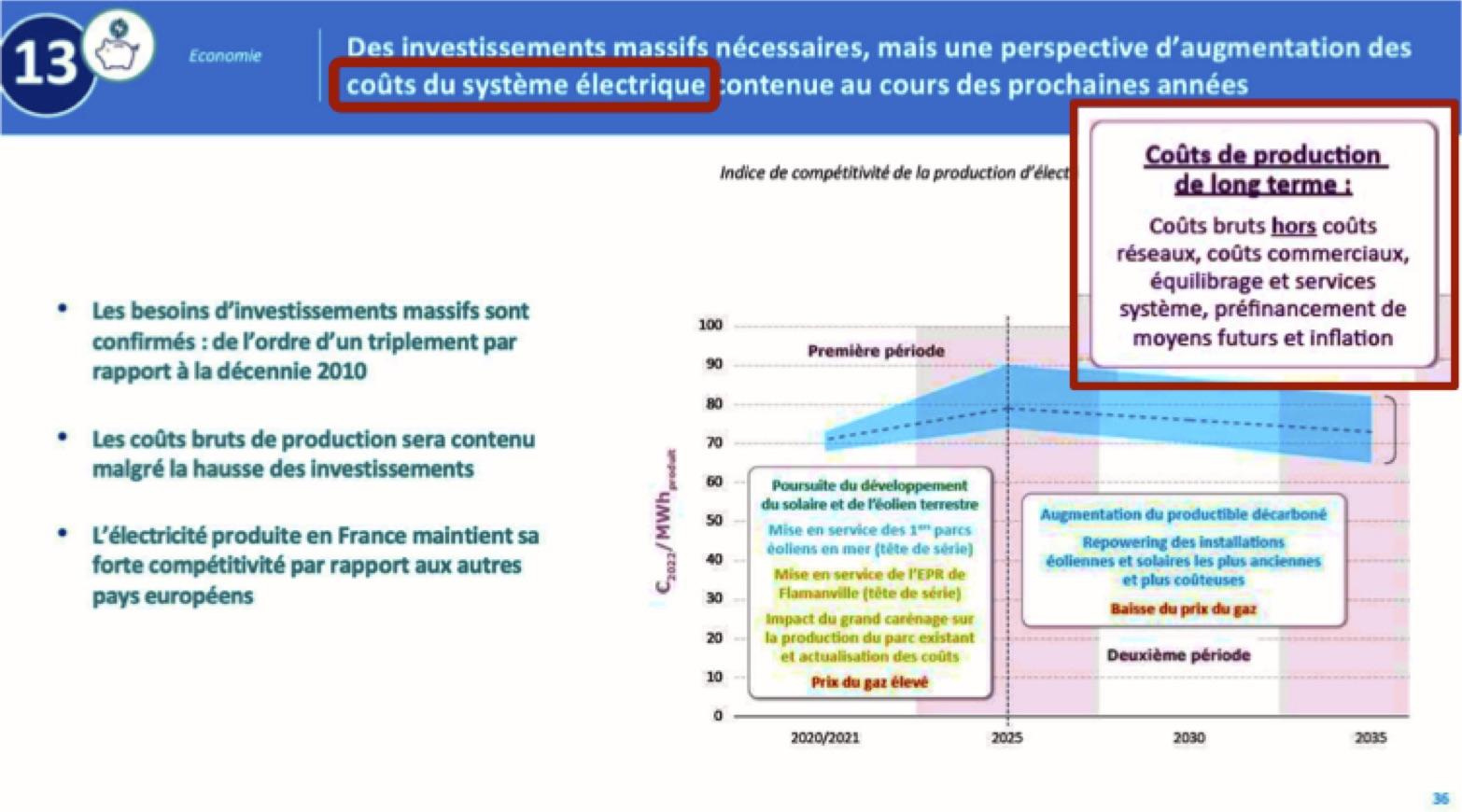 a) L’exercice d’évaluation du coût des divers scénarios présenté en juin 2023 n’a pas été actualisé, ni élargi et la seule présentation sur les coûts de production précise qu’ils sont hors coûts réseaux, coûts commerciaux, équilibrage et service système, préfinancement des moyens futurs et inflation, ce qui est inacceptable, d’autant plus que la figure est intitulée « Coût du système électrique ».
