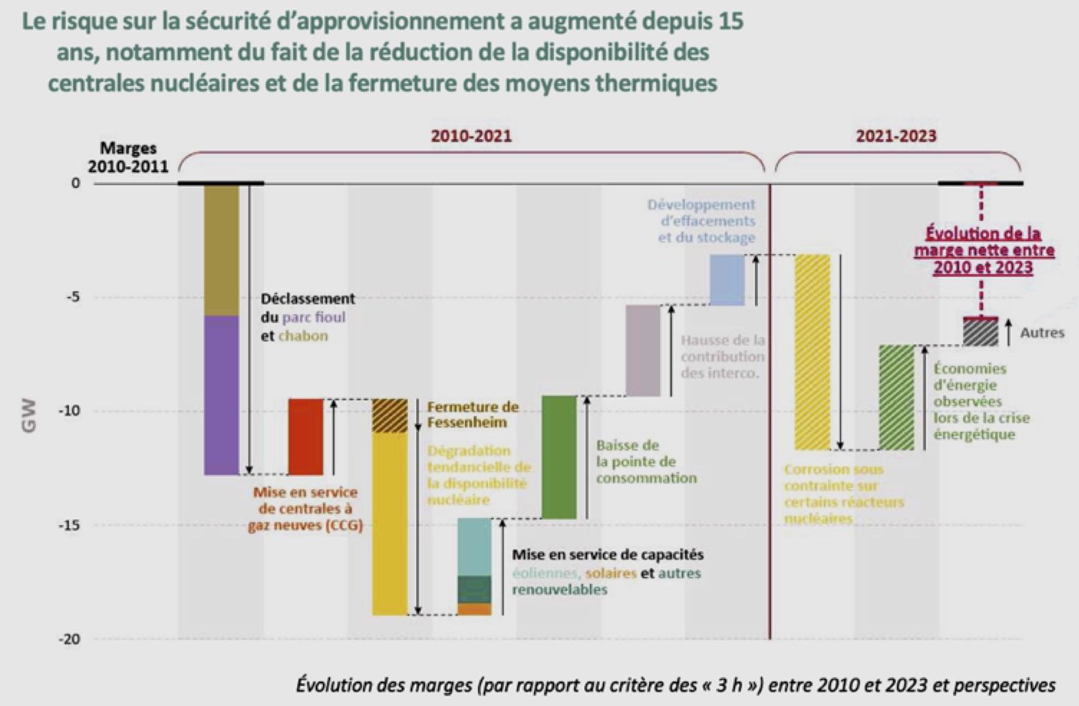 - RTE tente maladroitement de justifier a posteriori le déclassement du parc thermique fioul et charbon depuis 2010, et la dégradation de la sécurité d’approvisionnement qui en résulte[5] « nous en avions anticipé les conséquences, qui ont produit les effets attendus »[6]. On est en droit de se demander pour quel bénéfice ! Quant à l’arrêt de Fessenheim, c’est soi-disant l’épaisseur du trait[7] face aux aléas présentés comme imprévisibles du parc nucléaire, alors qu’ils l’étaient au moins en partie (grand carénage et travaux post Fukushima)[8].