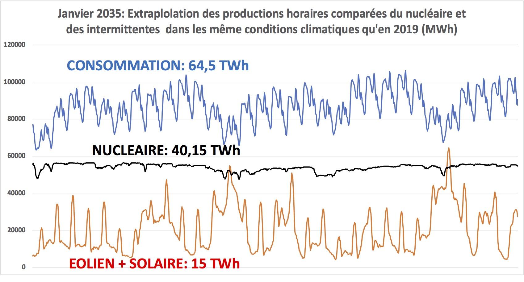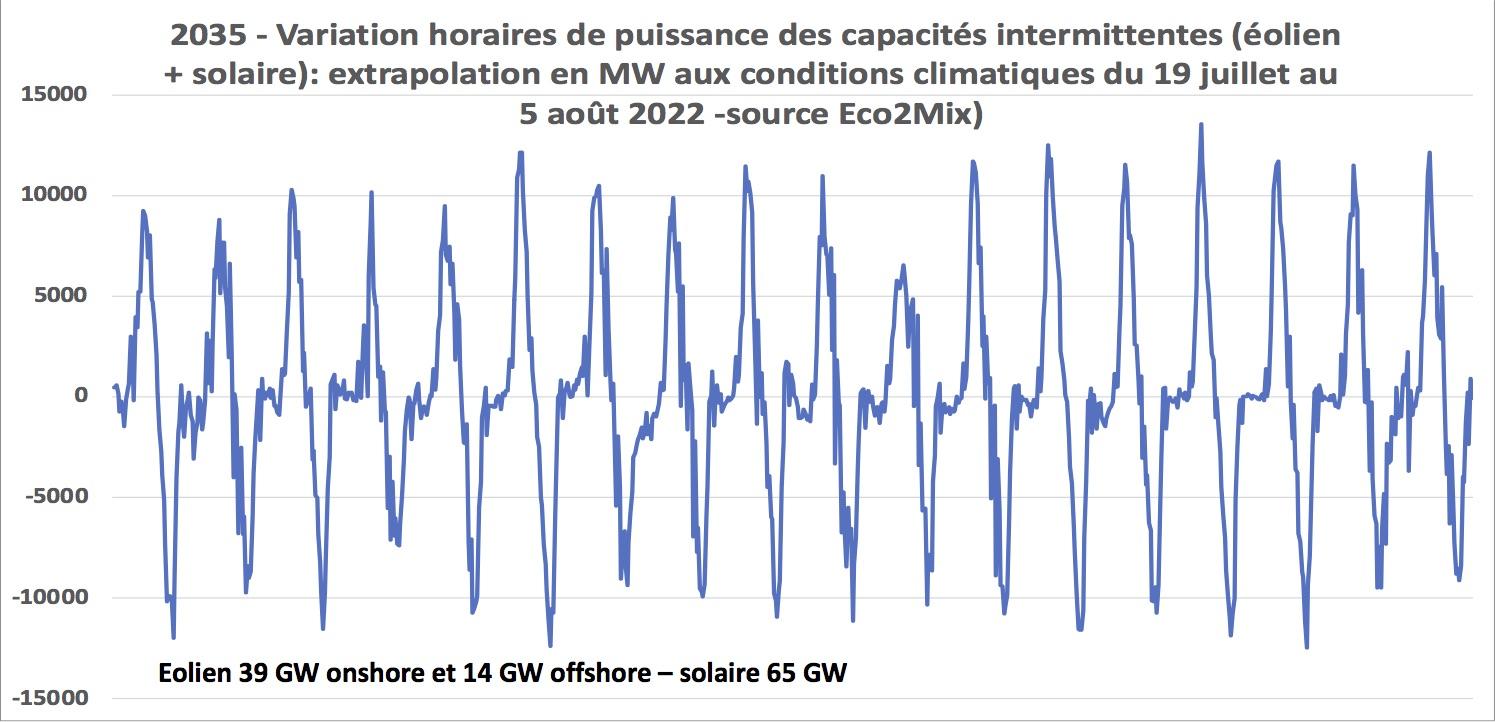 - En conditions hivernales la fluctuation de puissance sur une journée pourra atteindre une cinquantaine de GWe et on pourra avoir sur des périodes de 2 à 3 semaines des taux de charge extrêmement faibles, oscillant entre 3 et 10 % seulement de la capacité installée. L’importance des déficits de puissance dépasse de loin les projections, optimistes, d’efficacité et de flexibilité.
