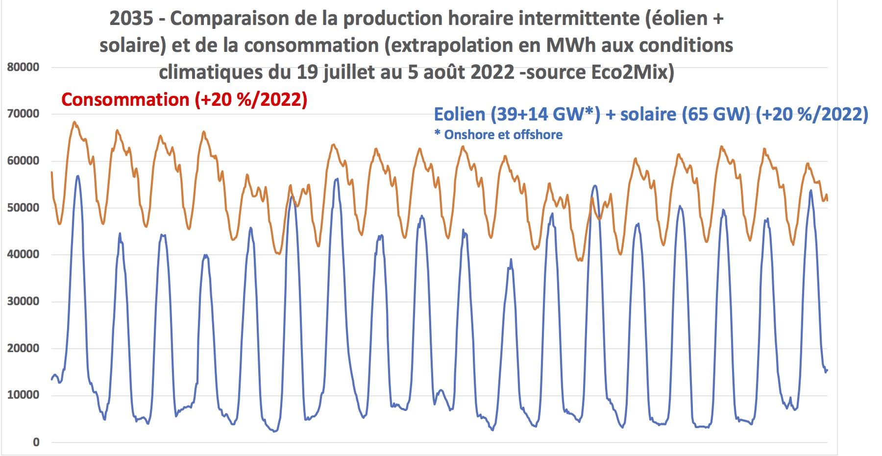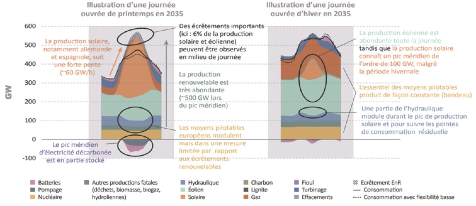 g) On ne peut qu’être surpris de la légèreté de la présentation faite de la gestion de l’intermittence. La gestion quotidienne des pics de production solaire (ou de leur absence) est abordée (très modestement) par les § 19 (P. 54) et 21 (P.60), avec recours à la flexibilité, à la modulation des pilotables et à l’écrêtement des ENRi. En effet une simple extrapolation à 2035 des productions actuelles aux capacités indiquées (122 GWe intermittents) montre la difficulté de la tâche, sauf à modifier très profondément les conditions d’acceptation de ces productions sur les réseaux (des écrêtements massifs seront indispensables, ce qui changera la rentabilité de ces sources et les règles de marché). Il est aisé, sur la base des données RTE téléchargeables sur le site Eco2mix, d’extrapoler les productions intermittentes en 2035 en tenant compte des croissances prévues des capacités de chaque source en supposant, ce qui est raisonnable, des données climatiques similaires aux actuelles.