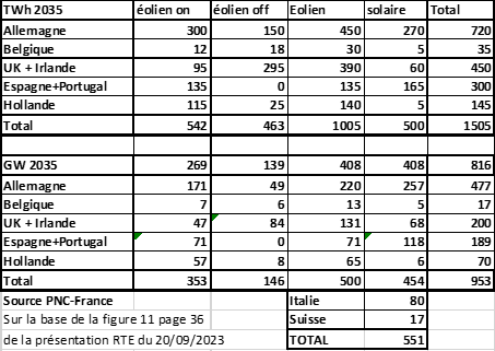- Et comment gérer ces situations si des centaines de GW éoliens et solaires débordent de pays voisins qui se sont interdit le recours au nucléaire et déclarent réduire drastiquement leur recours aux énergies carbonées. RTE ne l’aborde (fig. 30) que dans une carte d’Europe dont on ne peut extraire que des valeurs approximatives pour 2035 (source PNC), très inquiétantes. Espérons des données plus précises dans les documents à venir et des propositions de gestion des liaisons transfrontalières.