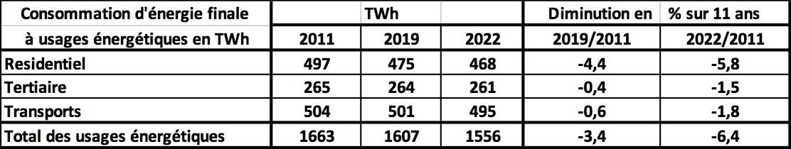 Un certain nombre d’objectifs semblent irréalistes si on se réfère au bilan des années passées. Les évolutions des consommations finales d’énergie depuis 2011 sont restées très modestes (tableau ci-dessous : Source :https://www.statistiques.developpement-durable.gouv.fr/bilan-energetique-de-la-france-en-2022-donnees-provisoires)