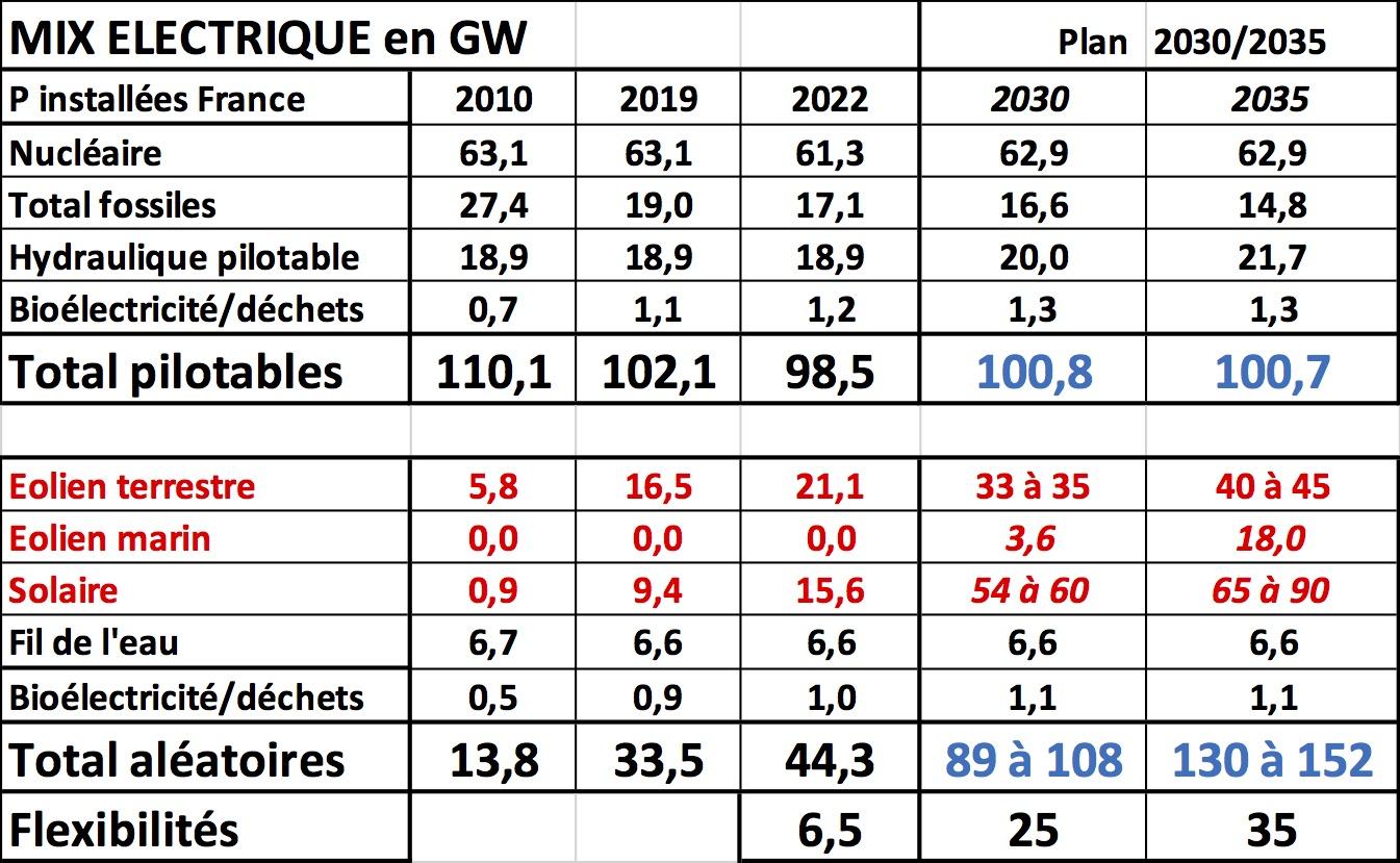 La faiblesse de la PPE (comme du bilan prévisionnel 2035 de RTE) est de ne proposer dans les 15 ans à venir qu’un développement ambitieux des énergies renouvelables électrogènes, solaire et éolien en quasi-totalité, et de flexibilités (35 GW en 2035 et déjà 30 GW en 2030). Ces objectifs sont probablement irréalistes compte tenu des lourds délais réglementaires, voire judiciaires, et du temps d’adaptation des réseaux et distributions. Il est important d’analyser l’évolution d’ici 2030 et 2035 de l’équilibre entre productions pilotables et productions intermittentes ou aléatoires. Elles sont présentées au tableau ci-après en fonction des données de RTE et de la PPE.