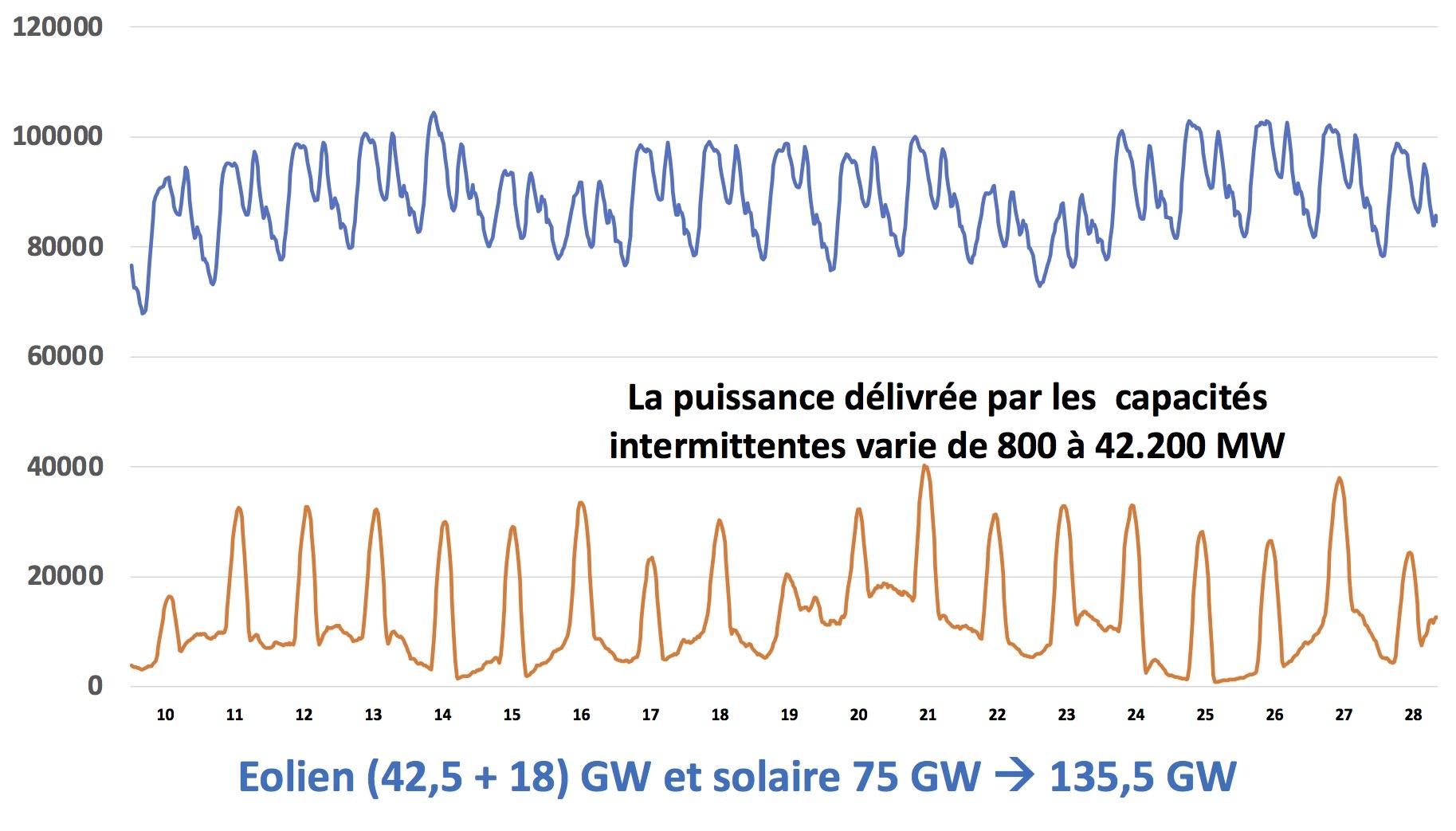 Du 10 au 28 janvier 2035 : extrapolation de la production intermittente dans des conditions climatiques identiques à celles de 2022 avec les capacités intermittentes de la SFEC. Évolution de 20 % de la puissance appelée crête compte-tenu d’une meilleure flexibilité.