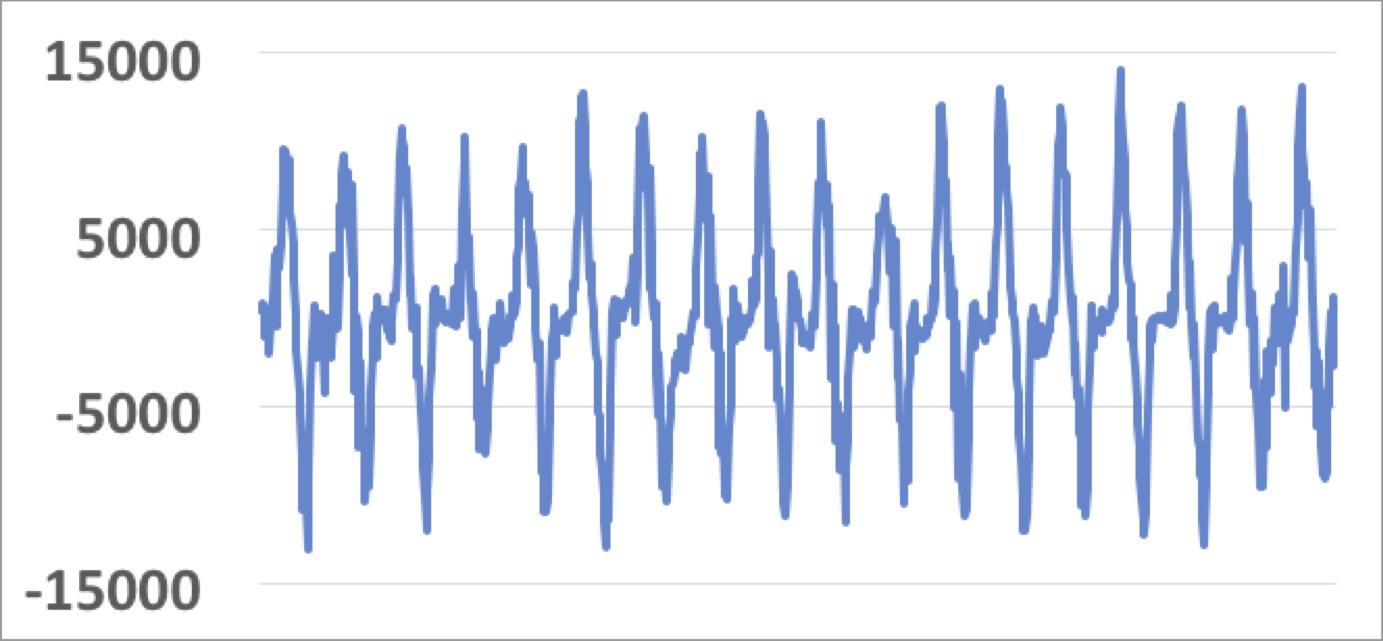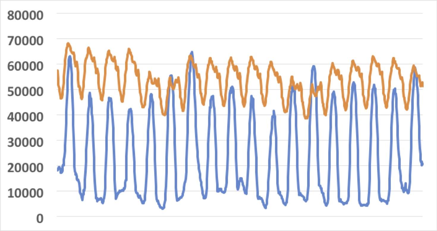 - En été, la problématique est différente. Avec un solaire surdimensionné, des variations de puissance considérables et biquotidiennes seront la règle avec une amplitude de 30 à 50 GW environ, matin et après-midi. (Figure ci-dessous)